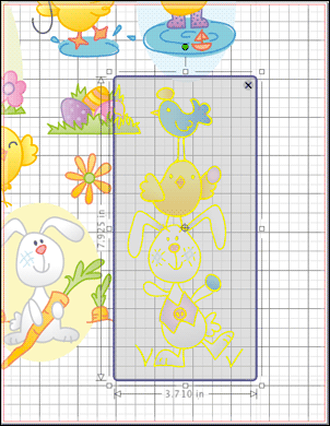 | 6. | Click on a section of the illustration set that is away from the area you just traced and delete it by going to Edit > Delete or by using the delete key on your keyboard. The image area that was not part of the area that you traced should now be gone, and your virtual mat should look similar to what is shown in the image below. You can now click on any of the little segments that were traced along with the main image (including the blades of grass near the rabbit's feet) and delete those as well. | ![]() |
